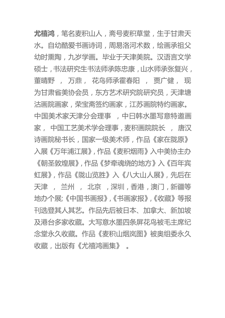 尤禧鸿,笔名麦积山人,斋号麦积草堂,生于甘肃天水。自幼酷爱书画诗词,周易洛河术数,绘画承祖父幼时熏陶,九岁学画。毕业于天津美院。汉语言文学硕士,书法研究生书法师承陈忠康,山水师承张复兴, 董晴野 , 万鼎, 花鸟师承霍春阳 , 贾广健, 现为甘肃省美协会员,东方艺术研究院研究员,天津塘沽画院画家,荣宝斋签约画家,江苏画院特约画家。中国美术家天津分会理事 ,中曰韩水墨写意特邀画家, 中国工艺美术学会理事,麦积画院院长 , 唐汉诗画院秘书长,国家一级美术师,作品《家在陇原》入展《万年浦江展》,作品《麦积烟雨》入中美协主办《朝圣敦煌展》,作品《梦牵魂绕的地方》入《百年宾虹展》,作品《陇山览胜》入《八大山人展》,先后在天津 , 兰州 , 北京 ,深圳,香港,澳门,新疆等地办个展;《中国书画报》,《书画家报》,《收藏》等报刊选登其人其艺。作品先后被日本、加拿大、新加坡及港台多家收藏。大写意水墨四条屏花鸟被毛主席纪念堂永久收藏。作品《麦积山烟岚图》被奥组委永久收藏,出版有《尤禧鸿画集》 。